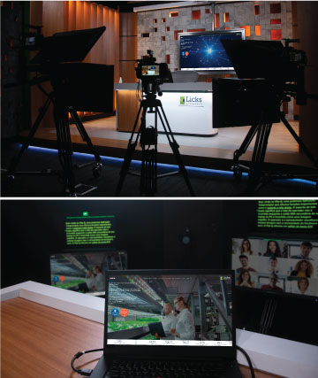 工作室配备了三台专业摄像机和两台特制提词器,演讲者既可用于朗读文本,也可用于与参会者进行多种视频会议形式的互动,还可以使用反馈耳机接收信息。