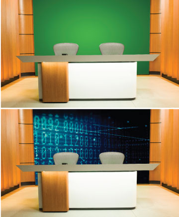 工作室设有两间功能各异的交互空间:一间配备电脑和屏幕的办公桌,可将任何内容显示在背景墙上或全屏供观众观看;另一间空间则配备了讲台、大型触摸屏显示器和交互式白板,方便用户直接根据呈现的内容进行互动。两个空间均可覆盖色键背景,从而实现不同的数字背景,并根据需要投影图像。